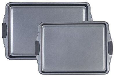 Solid carbon steel construction and rolled bakeware rims help withstand warping and denting, and the wide pan handles provide plenty of space for secure grip, even with oven mitts